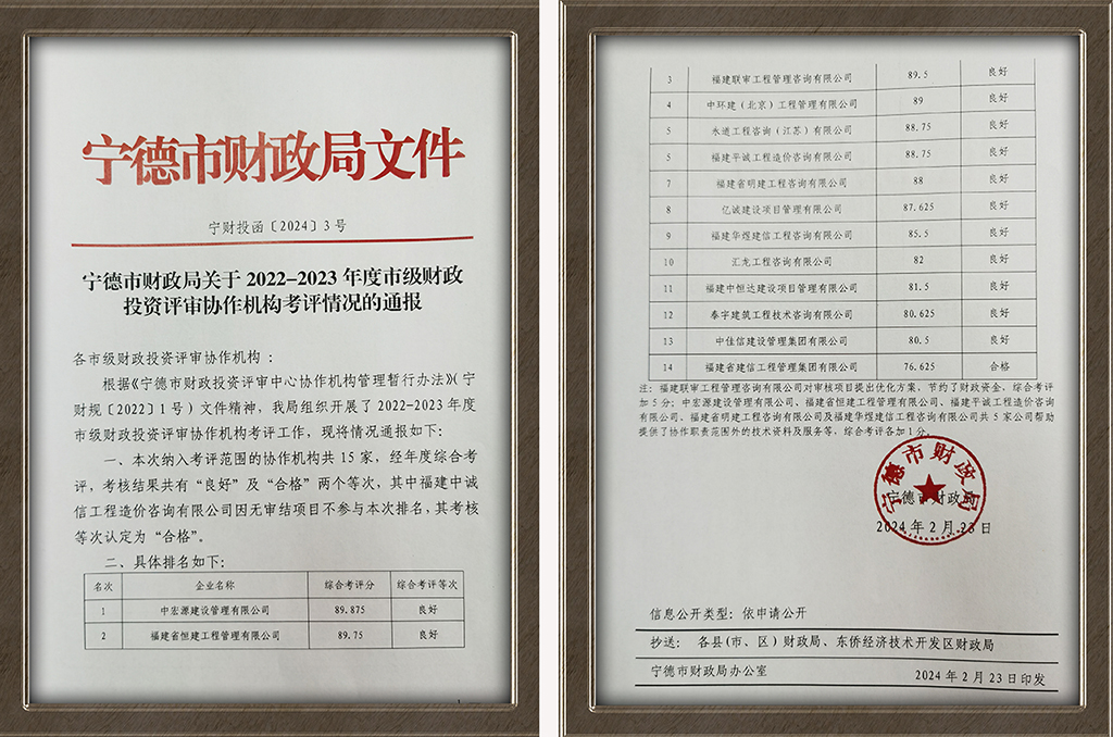 寧德市財(cái)政局發(fā)布《關(guān)于2022-2023年度市級(jí)財(cái)政投資評(píng)審協(xié)作機(jī)構(gòu)考評(píng)情況的通報(bào)》,經(jīng)嚴(yán)格的評(píng)估和考核,我公司獲得了“良好”的優(yōu)異成績,在15家評(píng)審機(jī)構(gòu)中位列第一。