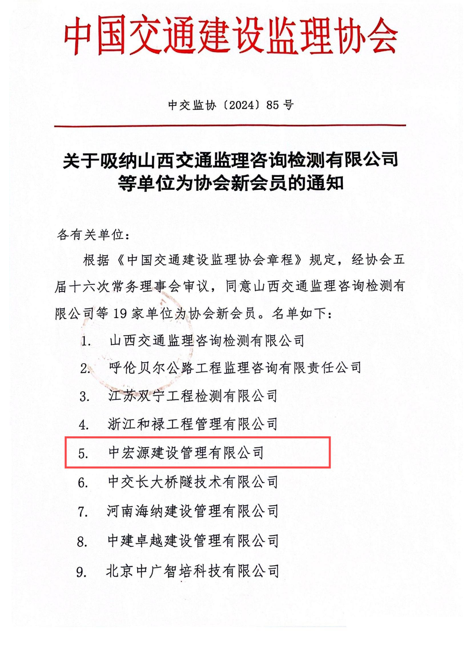 近日,中國交通建設(shè)監(jiān)理協(xié)會發(fā)布官方文件,宣布接納19家單位為協(xié)會新會員,中宏源建設(shè)管理有限公司名列其中,正式成為中國交通建設(shè)監(jiān)理協(xié)會的一份子。